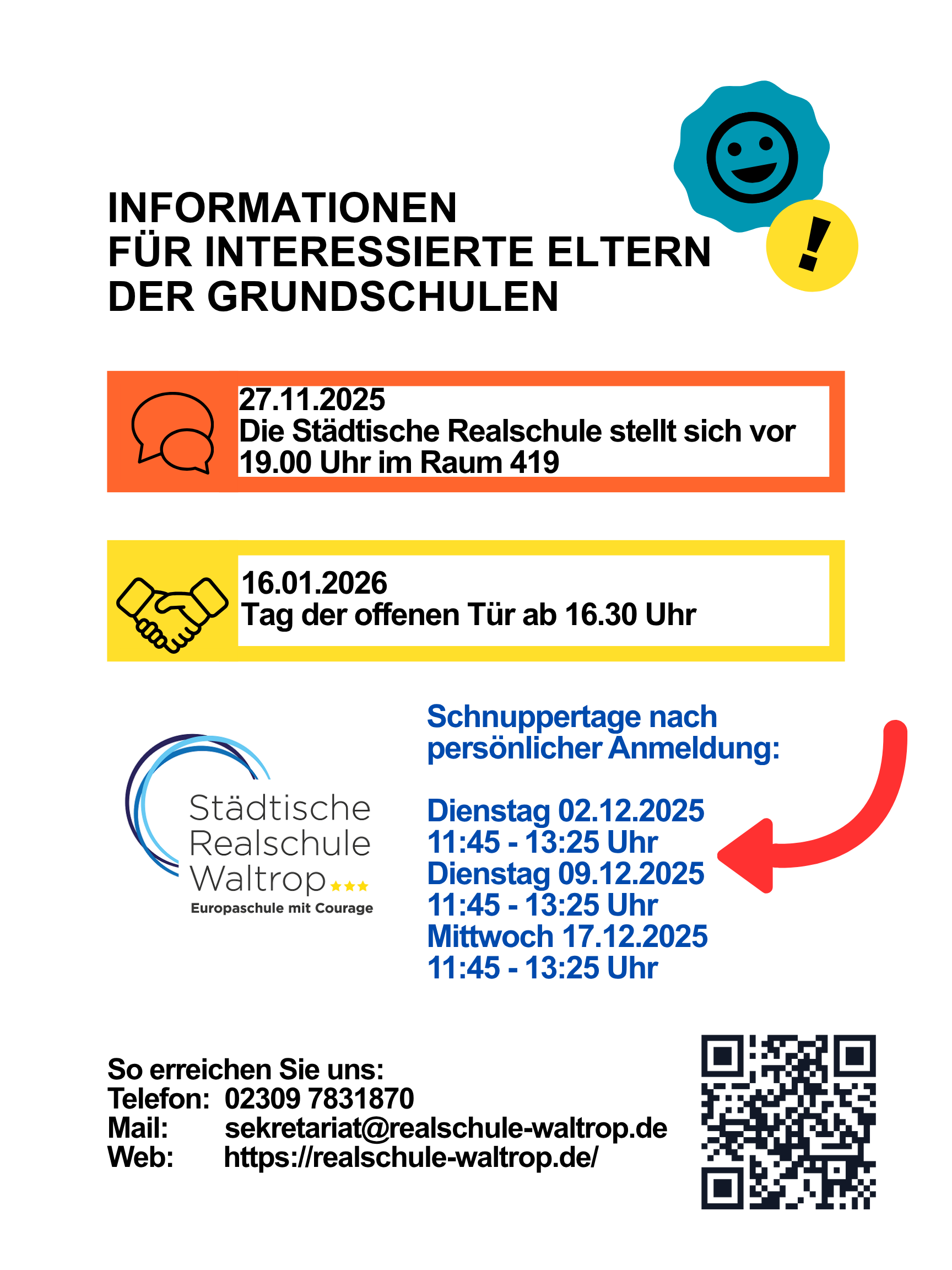 In der Städtischen Realschule Waltrop leben wir im schulischen Miteinander einen dialogischen Ansatz, indem wir Schülerinnen und Schüler ernst nehmen und sie in ihren persönlichen Belangen und ihrer schulischen Entwicklung unterstützen.