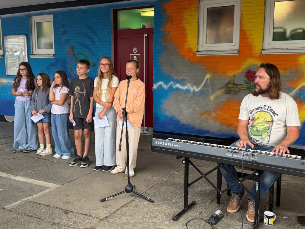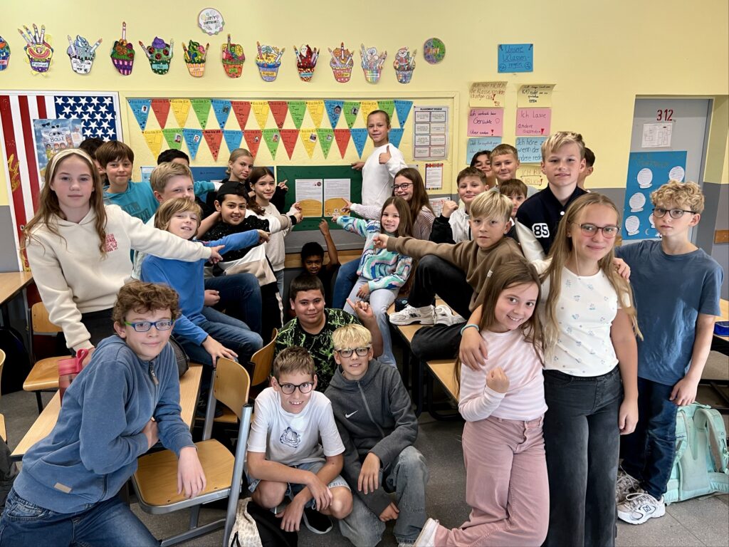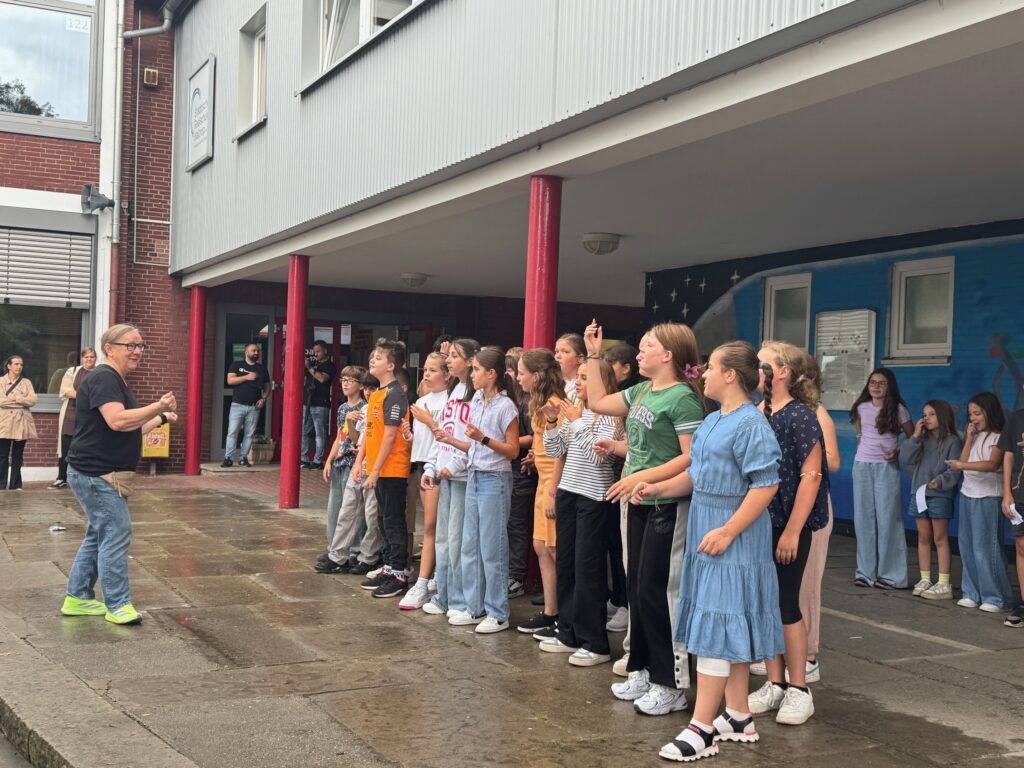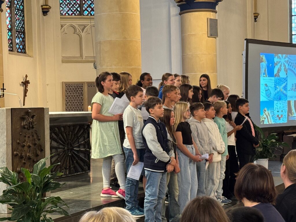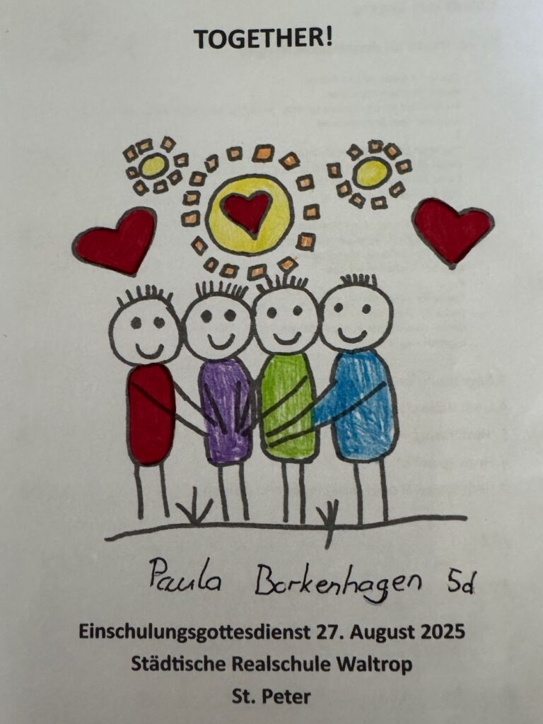 Heute war ein aufregender Tag für unsere neuen 5er. Mit einem stimmungsvollen ökumenischen Gottesdienst in St Peter ging es los. Die Klasse 6b und die Religionskurse von Frau Eckey, Frau Bonnat und Frau Werres hatten den Wortgottesdienst unter das Thema „Together“ (Gemeinsam / Miteinander) gestellt. Im Anschluss wurden Eltern, Verwandte und unsere neuen Schüler_innen auf dem Schulhof von fröhlichem Gesang und Musik der Music Family willkommen geheißen. Während die Kinder dann mit ihren Klassenleitungen ihren ersten Unterrichtstag erlebten, konnten die Eltern und Verwandten den Vormittag bei Kaffee (oder Wasser) und Kuchen verbringen.
