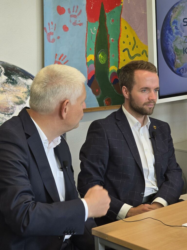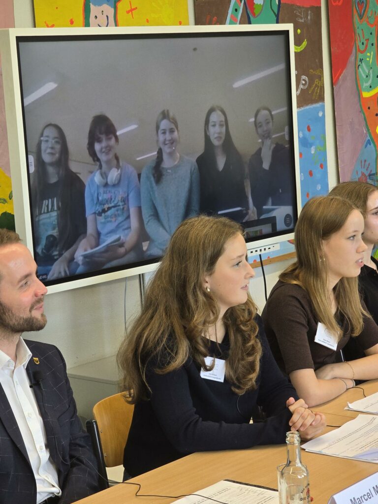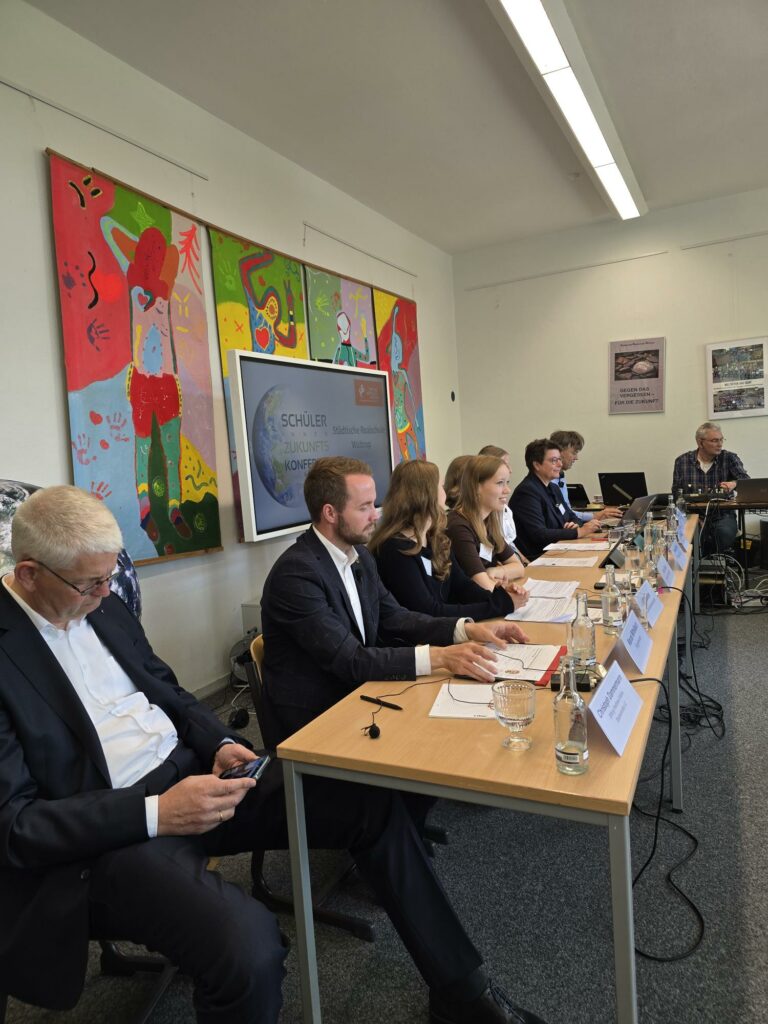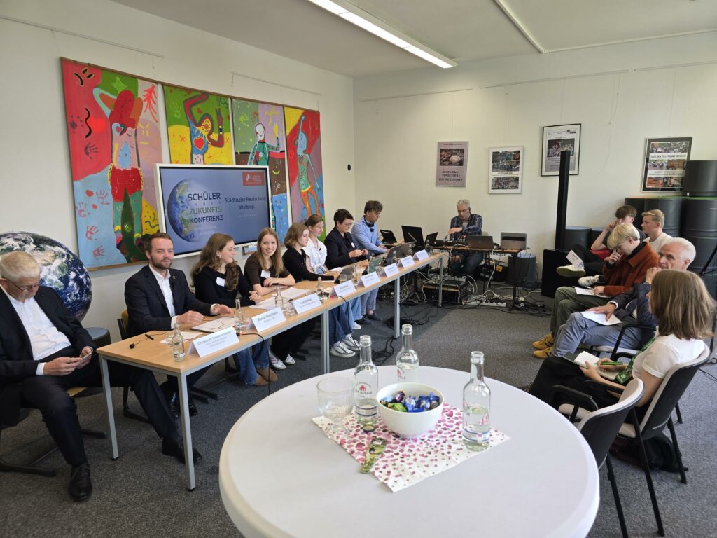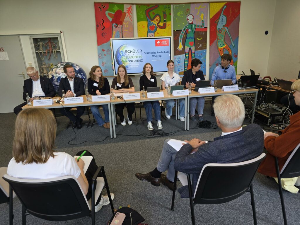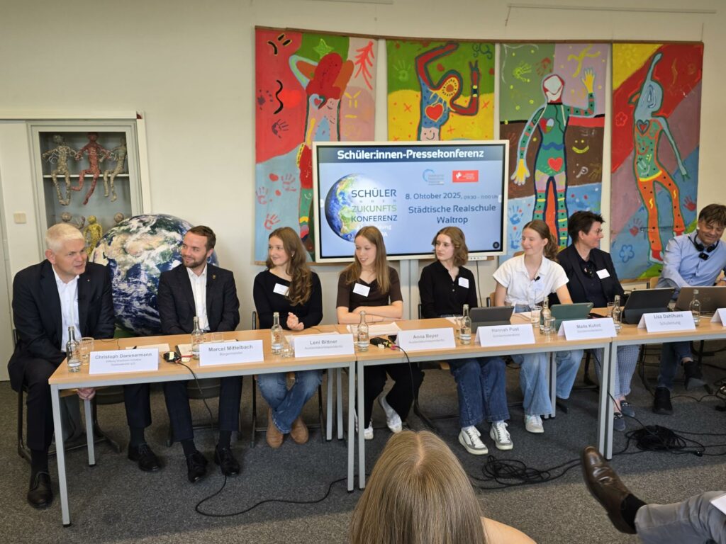 Am 8. Oktober findet in der Realschule Waltrop die Schüler_innenZukunftskonferenz statt, die mit Mitteln der Stiftung WestfalenInitiative unterstützt wird. Unsere Pressesprecherinnen Maite und Hannah, ebenso wie unsere Auslandskorrespondentinnen Anna und Leni stellten heute das Programm vor und interviewten Bürgermeister Marcel Mittelbach, Dr. Maria Hörhold, Glaziologin vom Alfred Wegener Institut in Bremerhaven und Herrn Christoph Dammermann von der Stiftung WestfalenInitiative. Außerdem gab es eine Live-Schalte zu unserer Partnerschule in Harderwijk. Zu den Initiatoren in Waltrop gehörte auch Dr. Klaus Strautmann, ehemals Geschäftsführer der Firma Langendorf in Waltrop.