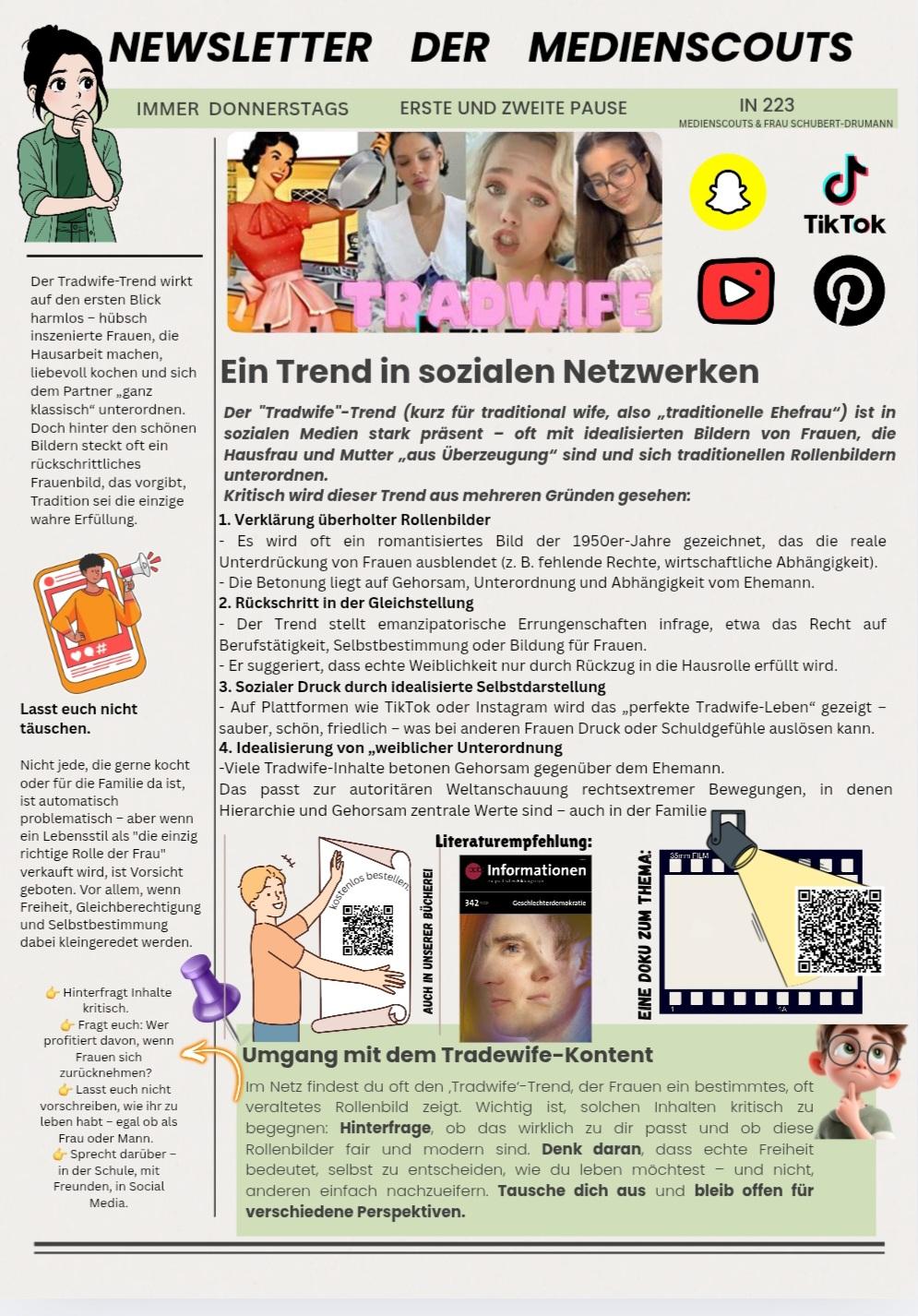 Unsere Medienscouts haben sich zum Thema „Informationsvielfalt im Netz“ schlau gemacht und sich dabei mit dem Schwerpunkt „Tradwives“ besonders intensiv auseinander gesetzt. Sie wollen Genaueres wissen? Dann geht es hier zum aktuellen Newsletter.